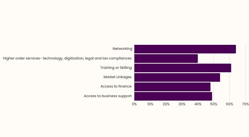 A majority of women entrepreneurs, appx. 75 percent lack access to mentorship, among the rest 25 percent that have access to mentorship 41 percent have access to institutional mentorship while 59 percent have access to individual mentorship program like National Rural Livelihood Mission, AIM and Women Entrepreneurship Program. Research shows that 60 percent women entrepreneurs perceive hyperlocal mentorship i.e., mentors with local connection in the industry and relevant areas can make mentorship more accessible.