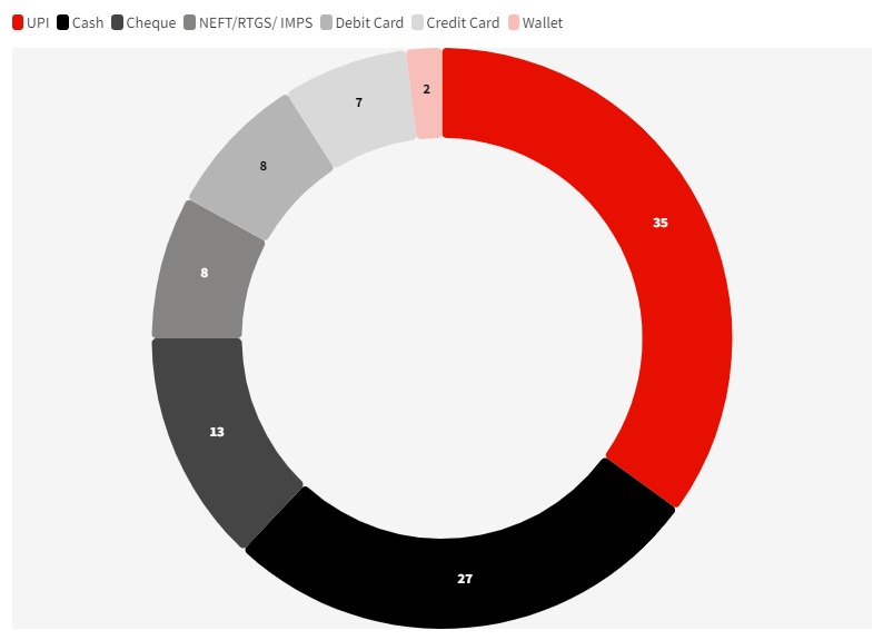 The usage of cash is predominant for payroll and employee expenses. Credit and Debit cards are mostly used in travel bookings. Net banking sees higher usage in operational and payroll expenses. Wallets are mostly used for e-commerce payments.